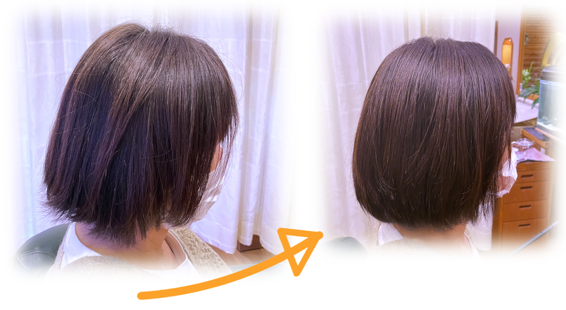 | GMT使用で通常のアイロン操作では伸びないクセも伸ばすことに成功しています | ||